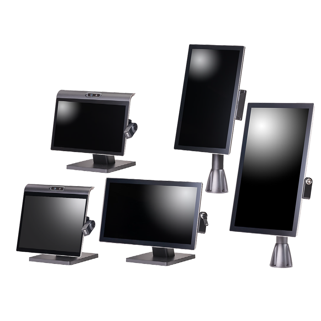 Integrated with Biometric Edge Computing for AI functionality, featuring a built-in camera on 15" and 15.6" displays, with an external mounting option for the 19.5" display