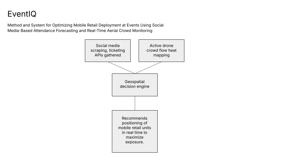 EventIQ integrates social media forecasting with real-time aerial surveillance to optimize mobile store deployment at large-scale venues. Prior to the event, a predictive engine scrapes social media platforms and ticketing APIs to quantify pre-event engagement, analyzing variables such as RSVP volume, post velocity (data collected after an event concluded), geographic origin of attendees, and influencer interactions. A regression model or neural net maps these signals to expected attendance curves and temporal crowd distribution estimates.