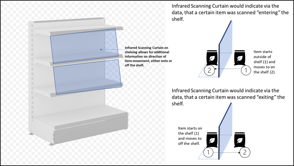 The novelty of the main idea is the ability of an infrared shelf scanning curtain to give context on whether an item entered or exited a shelf. This context would then be reflected in inventory data.