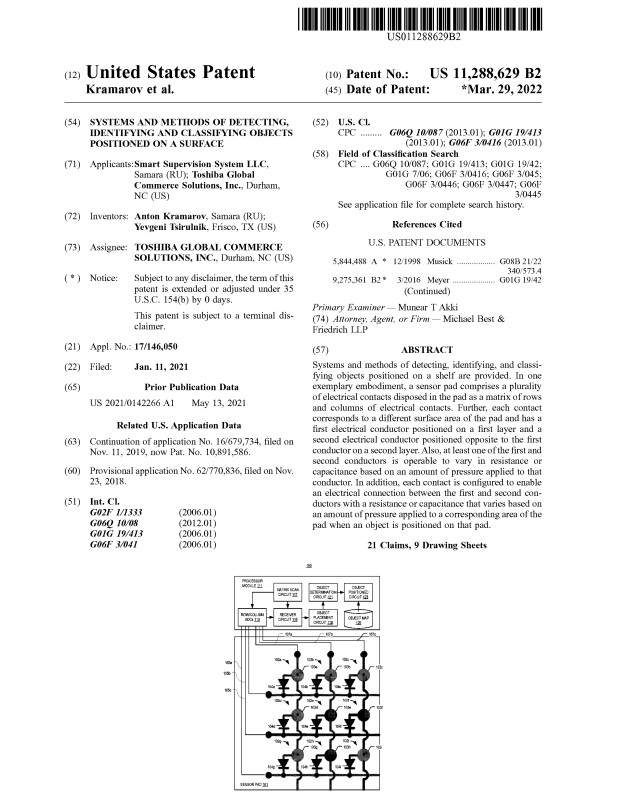 Systems and methods of detecting, identifying, and classifying objects positioned on a shelf are provided. In one exemplary embodiment, a sensor pad comprises a plurality of electrical contacts disposed in the pad as a matrix of rows and columns of electrical contacts. Further, each contact corresponds to a different surface area of the pad and has a first electrical conductor positioned on a first layer and a second electrical conductor positioned opposite to the first conductor on a second layer. Also, at least one of the first and second conductors is operable to vary in resistance or capacitance based on an amount of pressure applied to that conductor. In addition, each contact is configured to enable an electrical connection between the first and second conductors with a resistance or capacitance that varies based on an amount of pressure applied to a corresponding area of the pad when an object is positioned on that pad.
