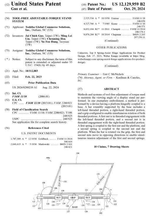 Methods and systems of tool-free adjustment of torque used to maintain the viewing angle of a display stand are performed. In one exemplary embodiment, a method is performed by a device having a platform hingedly coupled to a base. A bar rotatably supported by the base includes a left-hand threaded portion, a right-hand threaded portion, and a grip configured to enable simultaneous rotation of both threaded portions. A first nut is in threaded engagement with the left-hand threaded portion, and a second nut is in threaded engagement with the right-hand threaded portion. A first spring is coupled to the first nut and the platform, and a second spring is coupled to the second nut and the platform. When the bar is rotated via the grip, the first and second nuts move in opposing directions to enable simultaneous tension adjustment of the first and second springs.