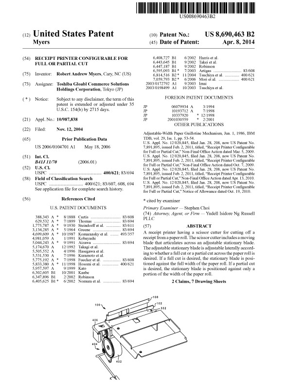A receipt printer having a scissor cutter for cutting off a receipt from a paper roll. The scissor cutter includes a moving blade that articulates across an adjustable stationary blade. The adjustable stationary blade is adjustable laterally according to whether a full cut or a partial cut across the paper roll is desired. If a full cut is desired, the stationary blade is positioned against the full width of the paper roll. If a partial cut is desired, the stationary blade is positioned against only a portion of the width of the paper roll.
